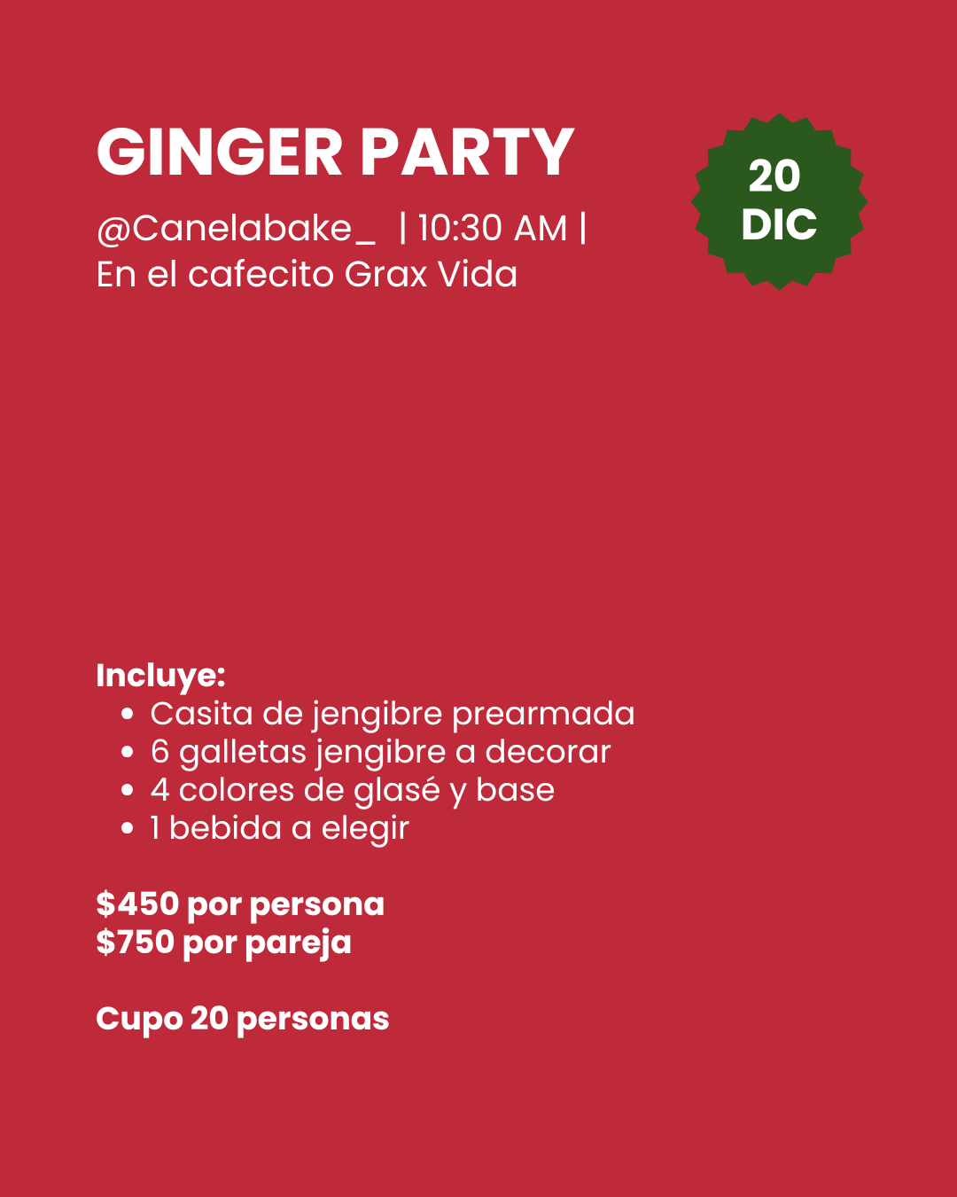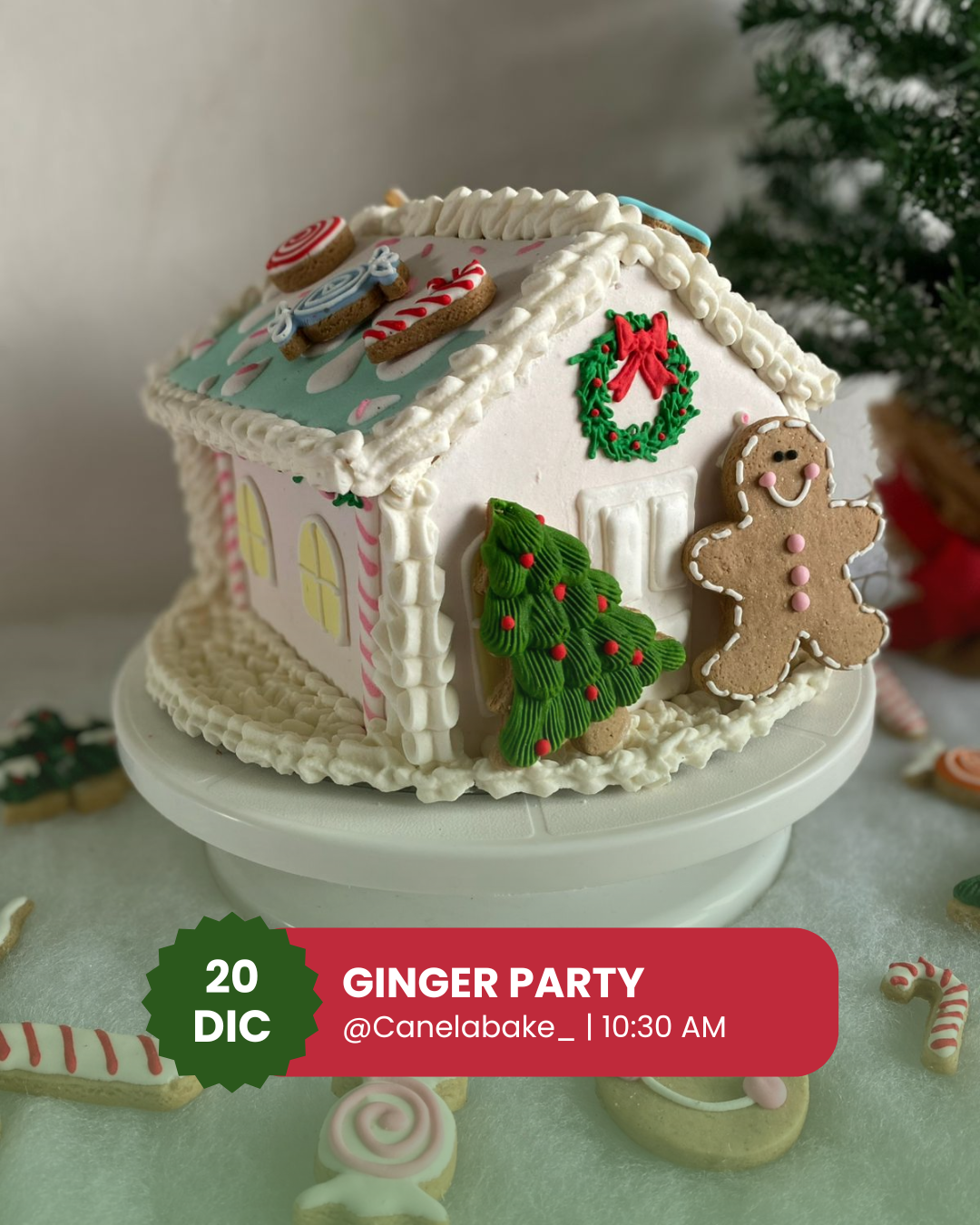 Incluye: Casita de jengibre pre armada, 6 galletas jengibre a decorar, material para decorar y 1 bebida a elegir.